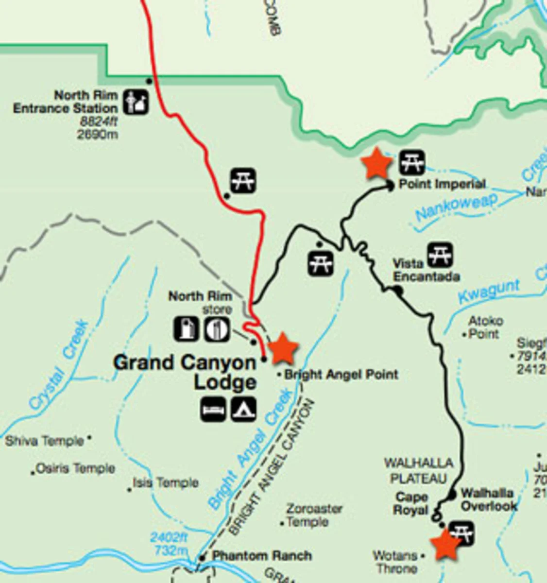 Although it requires more effort to visit the North Rim, 1 million visitors are rewarded for their efforts each year. Many consider the North Rim viewpoints to be more spectacular due to the higher elevation. Some viewpoints not to be missed are Point Imperial, Cape Royal and Bright Angel Point. You'll find views here that are sweeping panoramas but no Colorado River. For hiking, there are more options than the South Rim such as Cape Final (4 miles roundtrip), Uncle Jim Trail (5 miles roundtrip) and The Widforss Trail (9 miles roundtrip).